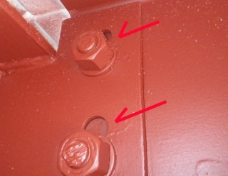 鉄骨のボルト接合部、ボルト孔が大きく拡大されている。