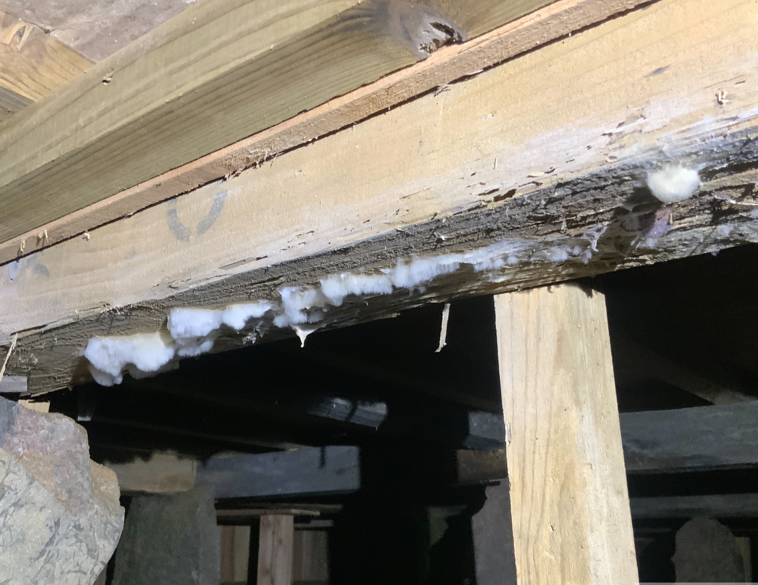 1393、購入して最初の夏、2階床梁に大量のカビが繁殖。床下を経由した夏場の湿気た外気が1階天井裏へ上がっていることが原因。家のそこら中にカビ被害が出ている。