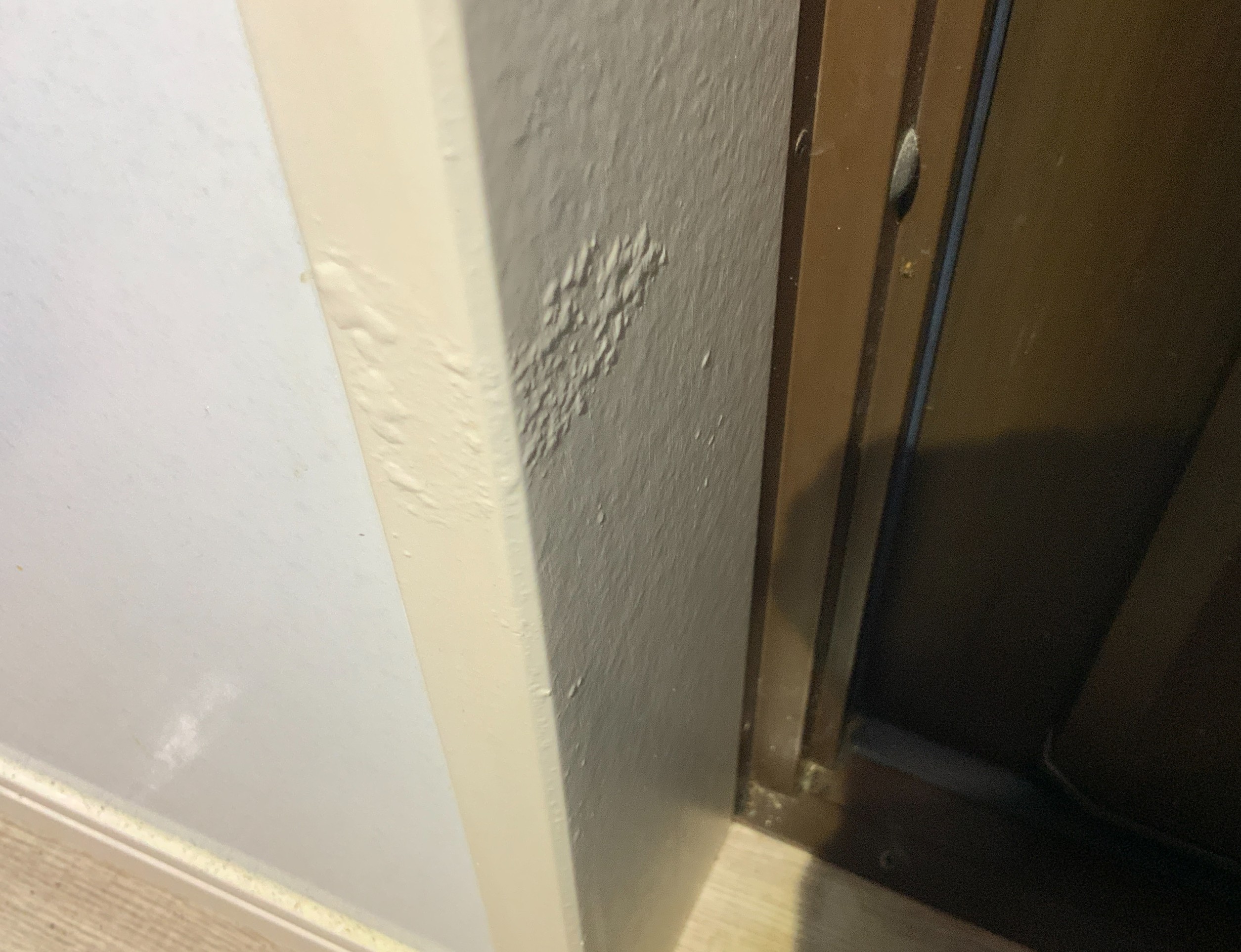 1414、ドア枠のシートが湿気で膨れている。壁、天井含め、家中が夏の外気の影響で湿気て、カビ被害が出ている。