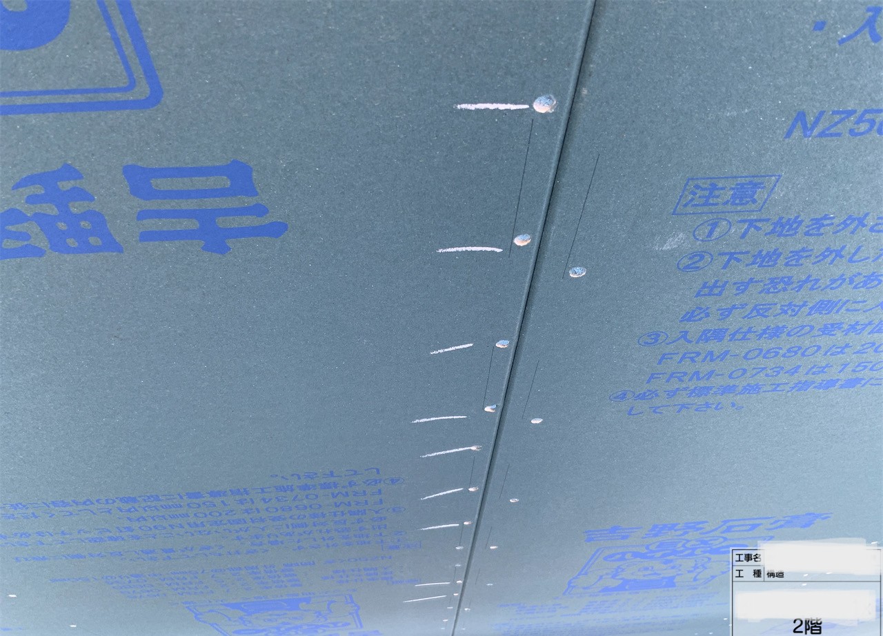 1424、外壁の構造用面材「EXハイパー」において、釘が材の縁に寄り過ぎて打たれている。このような施工は、地震時に釘まわりが破損しやすくなり、結果として所定の耐力を発揮できない。