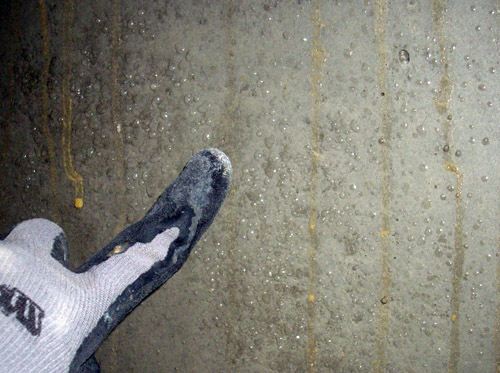 498、基礎のひび割れ。幅は約2mm。漏水、耐久性に十分影響が出る幅です。通常よく見かけるひび割れ幅は0.1、0.2mm程度。 平成24年2月3日