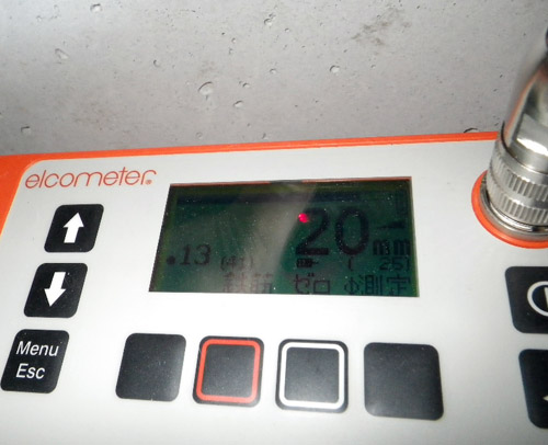 463、機械で鉄筋の位置を確認。表面から鉄筋までの距離が30mm必要なところ、20mmしかない。建築基準法違反。 平成23年9月30日