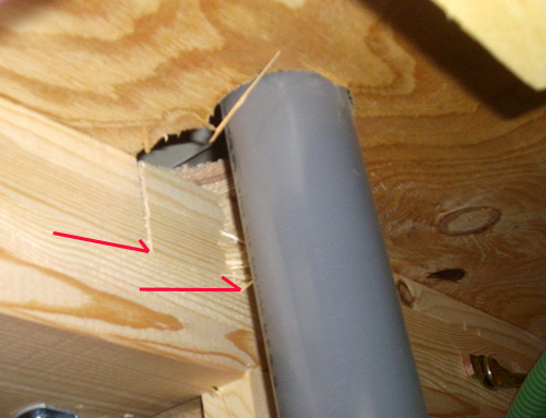 493、2階の排水管。施工時に穴あけをした際、梁を一緒に切ってしまった。穴の位置は、開け替えたが、梁は未補修のまま、隠蔽。 平成24年1月17日